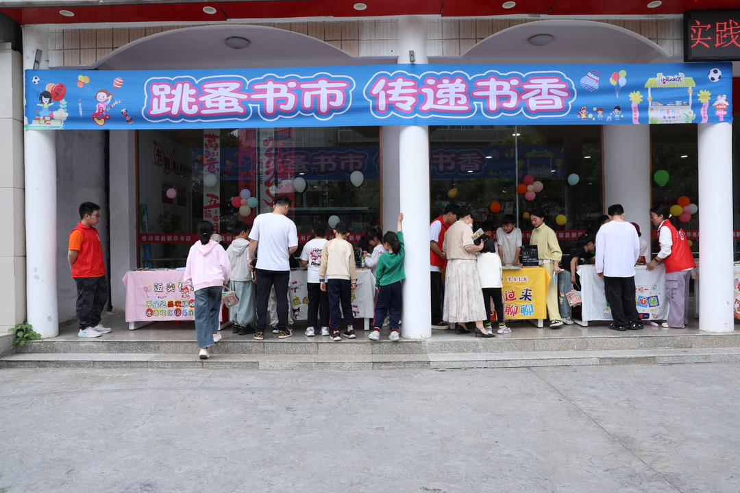 在室外,跳蚤书市吸引了众多孩子的参与。新华书店的志愿者们提前布置了摊位,孩子们带来了自己闲置的书籍,通过互换或购买的方式,体验了“以书会友”的乐趣。