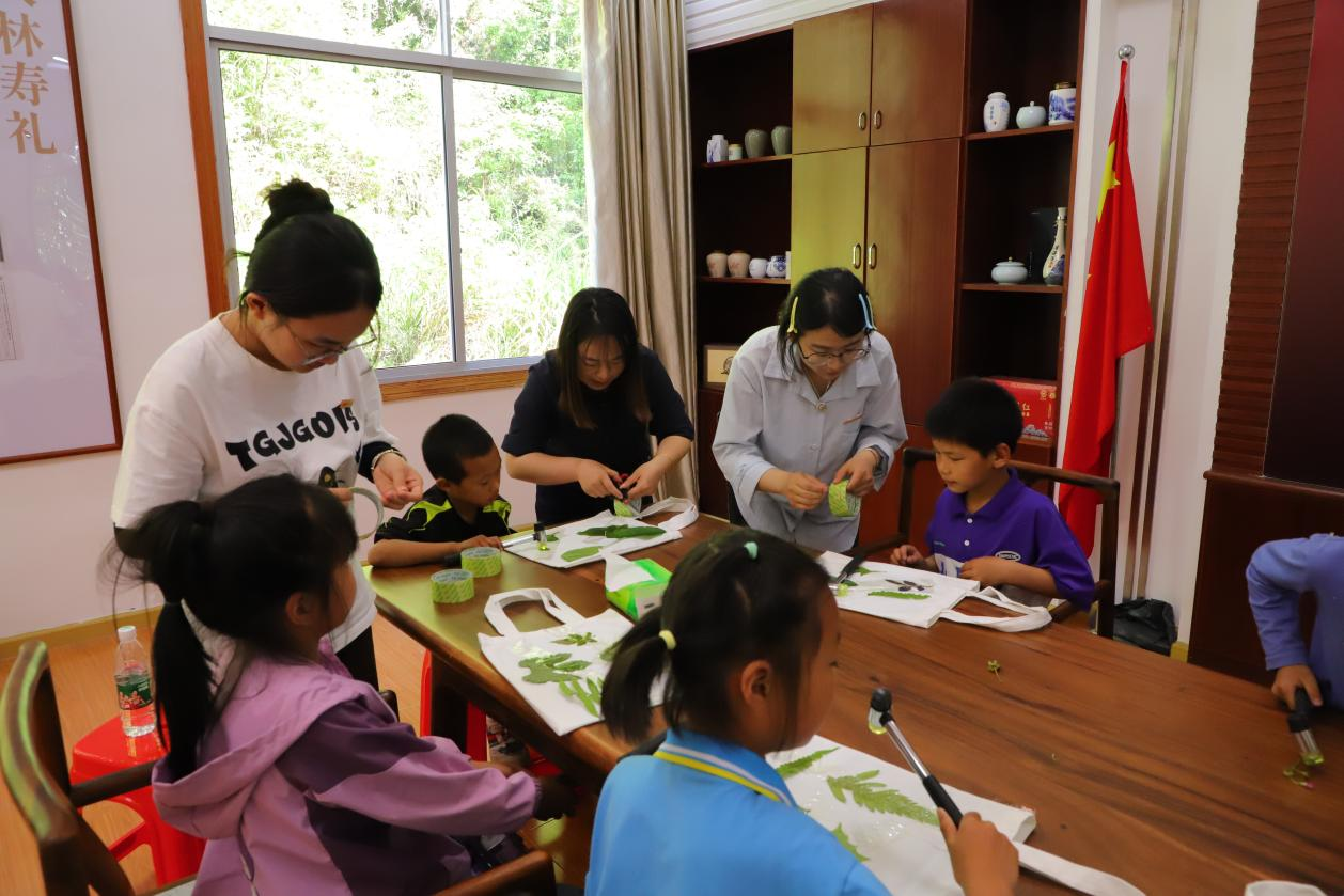 为深化实践体验,志愿者为孩子们准备了植物拓印材料包。活动现场欢声笑语不断,一幅幅充满童趣的拓印作品成为孩子们独特的研学纪念。通过将新鲜植物材料进行科学处理,运用物理拓印技术,将叶脉纹理、花瓣形态等植物特征转化为艺术图案。这一创作过程既展现了植物形态学的科学内涵,又培养了孩子们的审美创造力。