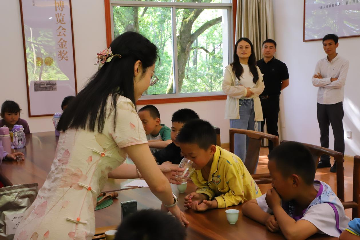 转入室内后,学院教师志愿者向孩子们展示了传统制茶工具,并生动讲述茶叶从采摘到制作的全过程。在互动环节,老师现场演示了沏茶技艺,孩子们从视觉、嗅觉、味觉多维度感受茶汤的色泽变化、香气层次与滋味特征。茶香袅袅间,孩子们手捧茶盏,细细品味茶的清香与回甘,感受到了中国传统茶道的审美意蕴。